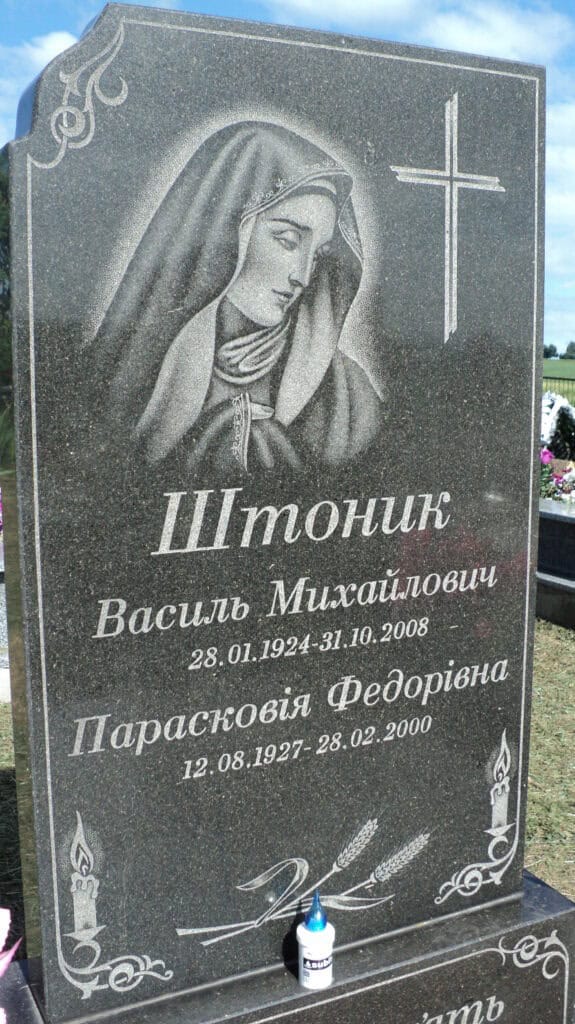 Похований (на): Штоник Василь Михайлович 28.01.1924 – 31.10.2008 Парасковія Федорівна 12.08.1927 – 28.02.2000