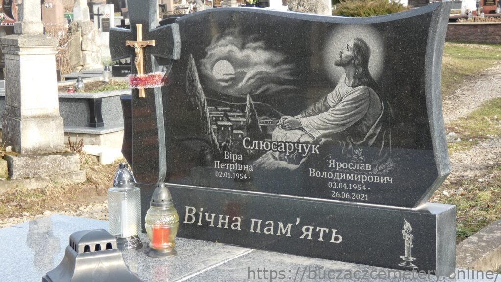 Напис: Слюсарчук/ Віра Петрівна 02.01.1954-/ Ярослав Володимирович 03.04.1954-26.06.2021/ Вічна пам’ять//.