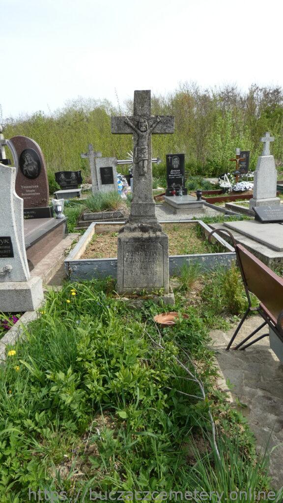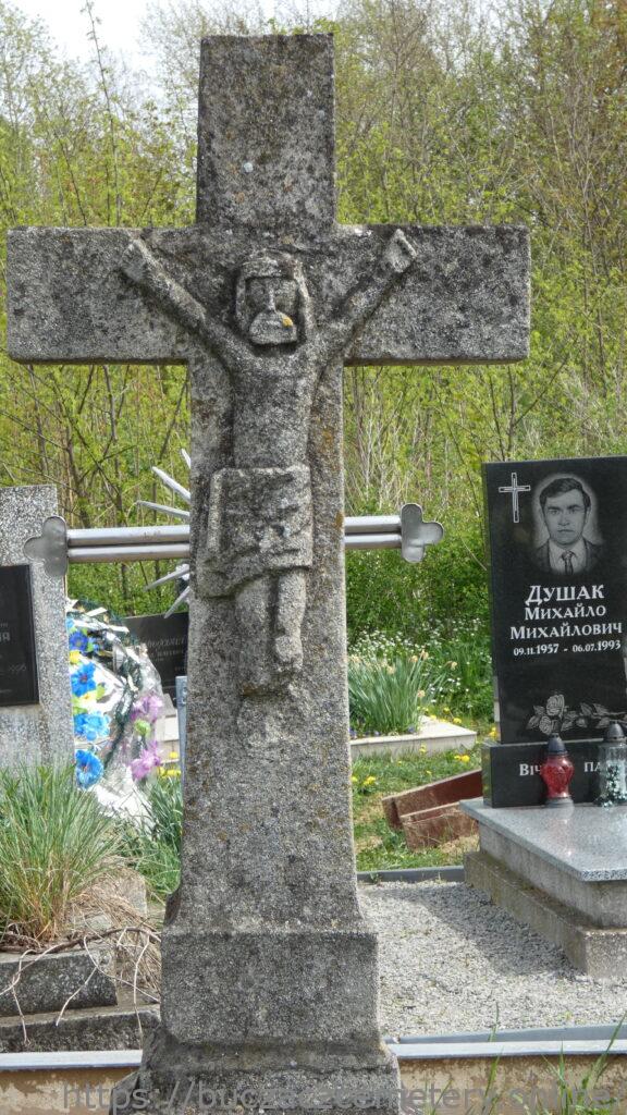 Місце поховання позначене хрестом на постаменті. Хрест на постаменті. На перехресті рук рельєфно зображено Христа. Плінтус з профільованими верхніми краями. З чотирьох боків різьблені рамки з чверть кругло зрізаними верхніми кутами, на лицьовій стороні вигравіюваний напис.