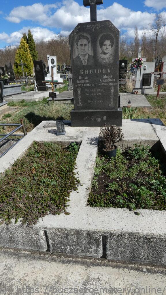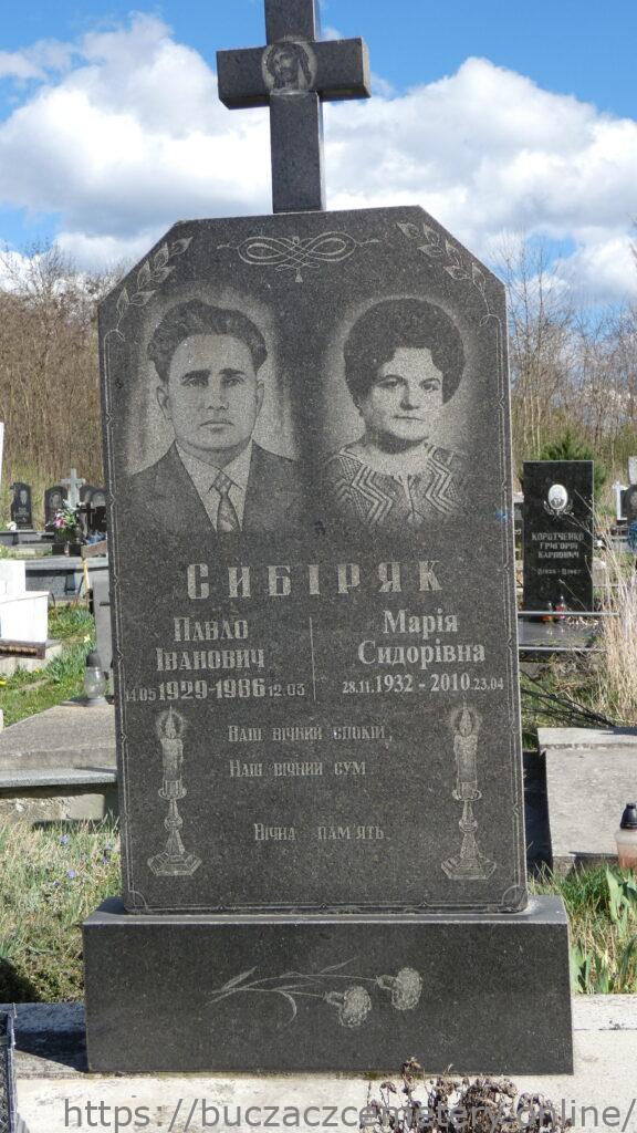 Напис: Сибіряк/ Павло Іванович 14.05.1929-1986.12.03./ Марія Сидорівна 28.11.1932-2010.23.04/ НАвш віічний спокій, Наш вічний сум.
