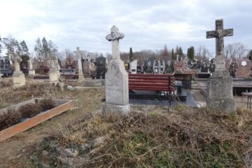 Місце поховання позначено хрестом на двоступеневому постаменті та підставці, з перев’язкою. Хрест із раменами, що завершуються у вигляді трилисника, на постаменті. На перетині рамен висічено менший хрест. Перша сходинка плінфи з профільованими верхніми краями, з гравійованим написом на лицьовій частині (1). Друга сходинка цоколя через профілювання переходить ступеневий дах. Спереду Читати далі
