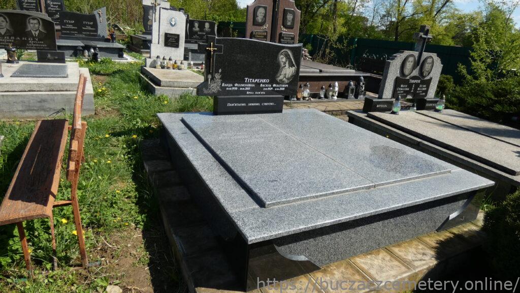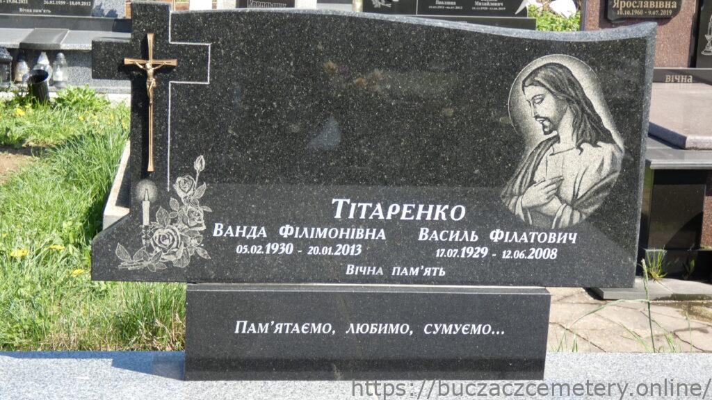 Напис: Тітаренко Ванда Філімонівна 05.02.1930-20.01.2013/ Василь Філатович 17.07.1929-12.06.2008/ Вічна пам’ять/ Пам’ятаємо, любимо, сумуємо…