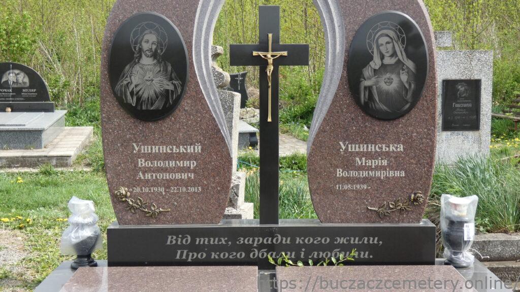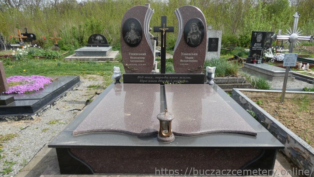 Напис: Ушинський Володимир Антонович 20.10.1930-22.10.2013/ Ушинська Марія Володимирівна 11.05.1939-/ Від тих, зарази кого жили, про кого дбали і любили./