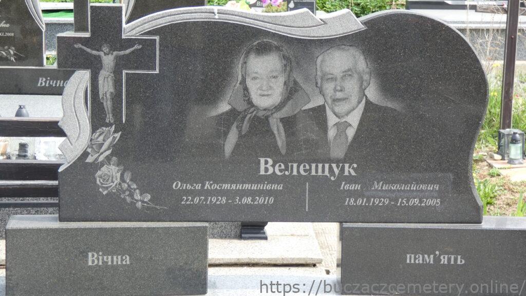 Напис: Велещук Ольга Костянтинівна 22.07.1928-3.08.2010/ Іван Миколайович 18.01.1929-15.09.2005/ Вічна пам’ять/