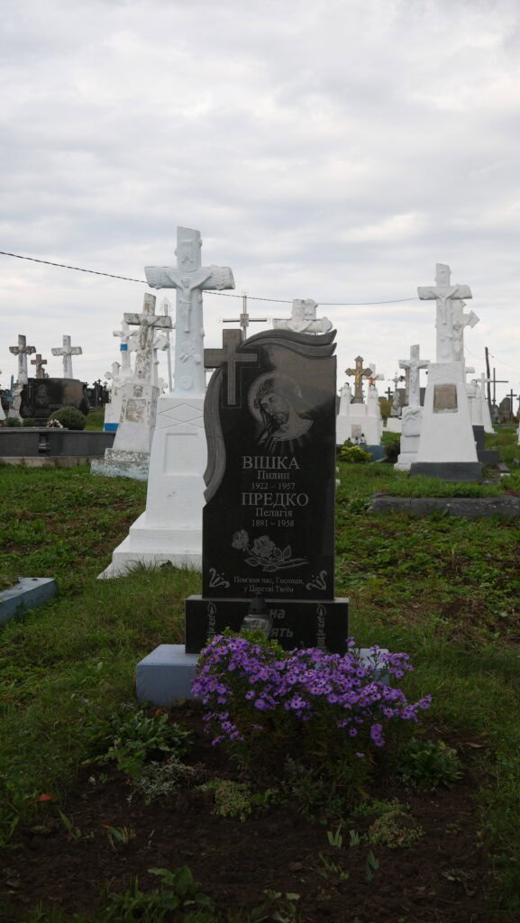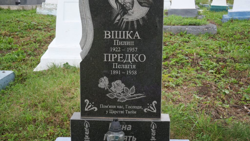Надпис: “Вішка Пилип 1922-1957 Предко Пелагія 1891-1958 Пом’яни нас ,Гсподи,у Царстві Твоїм вічна пам’ять”